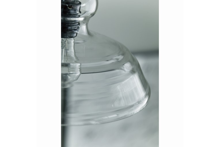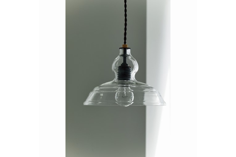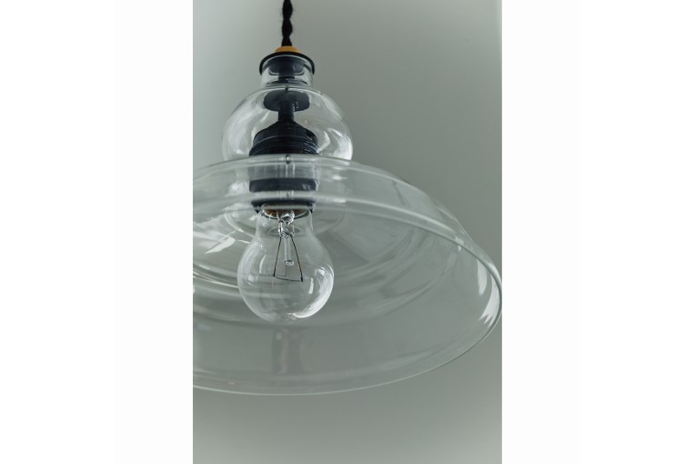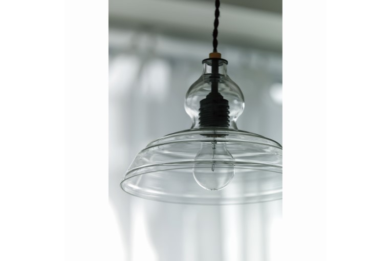 上部の丸みや中間がくびれたフォルムは瓢箪を彷彿するガラスペンダントライト。 普天的な素材のクリアガラスとネジリコード、ネジリソケットのBKがアクセントになっています。 場所を選ばないサイズ感も〇です。
