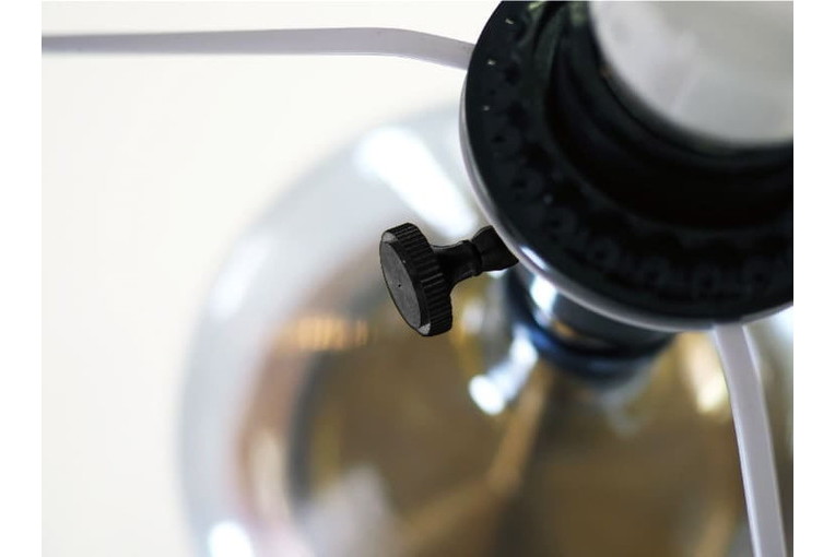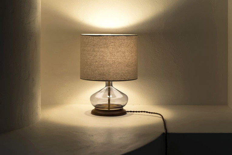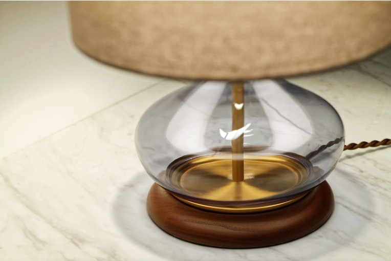 セードにはファブリック生地を、本体にはガラス、ウッド、スチールと、性質も質感も異なる素材をバランスよく組み合わせました。