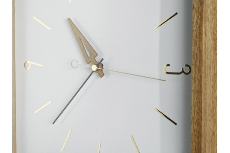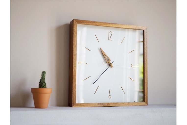 ホワイトの文字盤にゴールドのインデックスと数字が輝く、スクエアフォルムのウォールクロック。