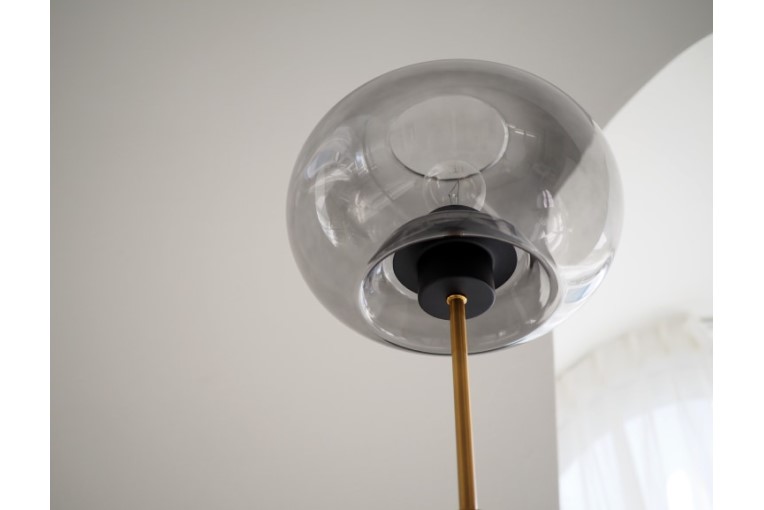 オーバルのガラスセードと直線的な支柱の洗練されたシルエットがスタイリッシュなフロアライト。