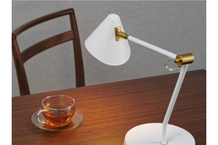 緩やかなウェーブを描くようにカットされたセードが柔らかな光を広げるフェミニンなデスクライト。