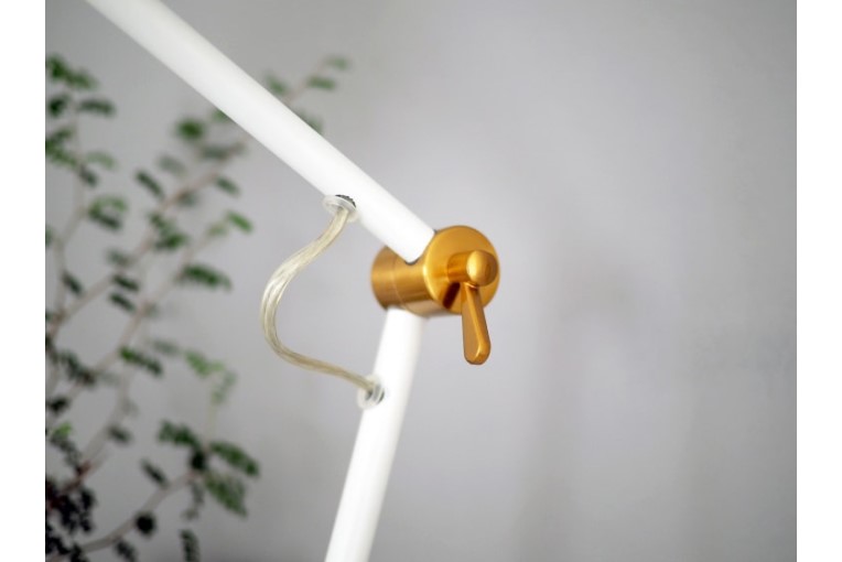 マットホワイトで統一された中に取り入れた真鍮を思わせるゴールドのパーツで、ぐっと大人っぽい雰囲気に。