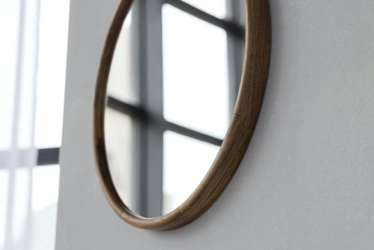 角を落とした滑らかなウッドフレームが高級感を感じさせるウォールミラー。