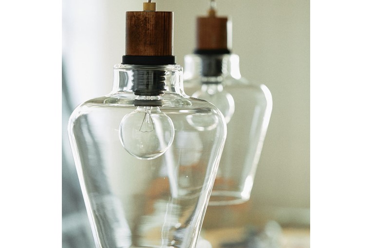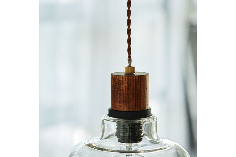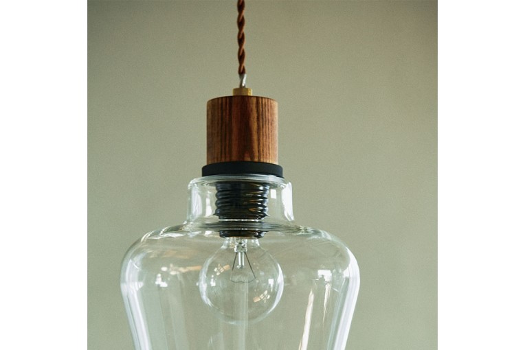 柔らかいフォルムのガラスに存在感のあるタモ材のガラスペンダント。