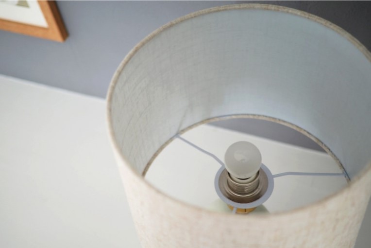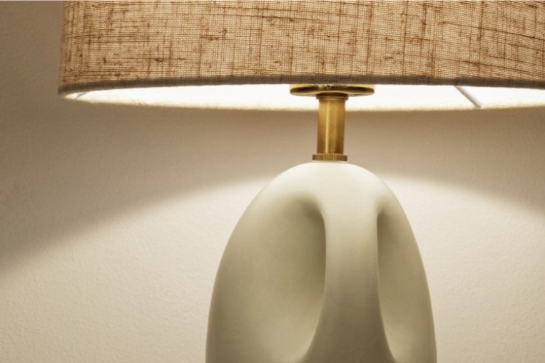 上下の開いたファブリックセードが下側へも光を広げることで、ボディの素材感やシルエットが際立ちます。