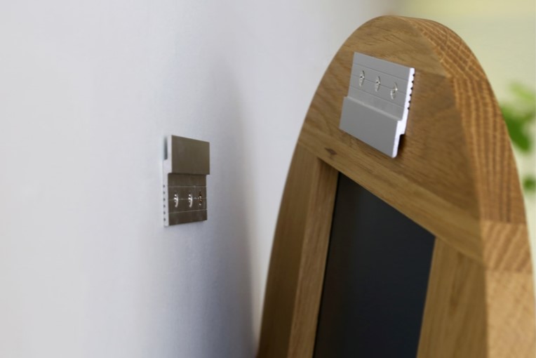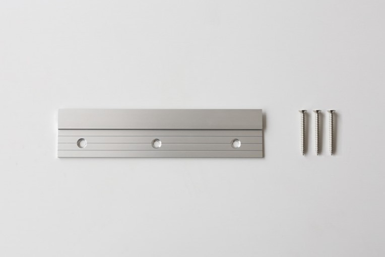 ミラーの背面には、アルミニウム製の金具を取り付けています。フック状の小さなパーツを先に壁面に固定してから、本体を取り付けるドッコ式です。壁面と吊り鏡が密着し、取り付け取り外しが容易です。