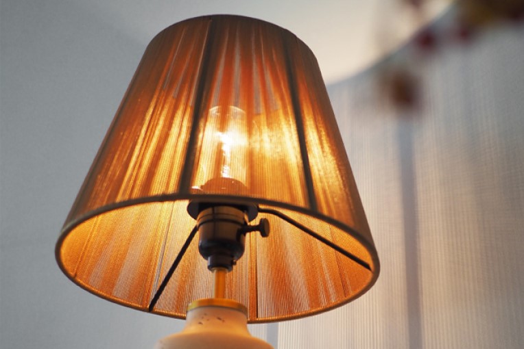 光沢のあるブラウンの紐を巻きつけてセードを形成しています。隙間から漏れる絶妙な明かりと周りに広がる影模様が、洗練された雰囲気を漂わせます。
