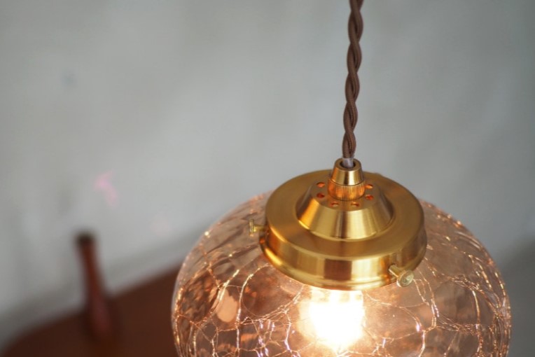 ぽってりとしたフォルムのガラスセードにブライトゴールドのソケットが調和した、オリエンタルなペンダントライト。