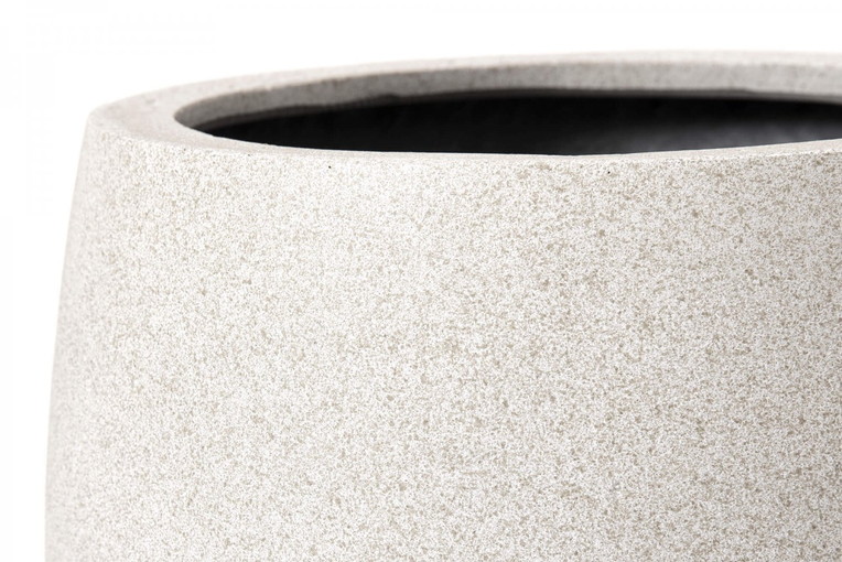 ぽこんとした卵のようなフォルムが可愛いアイボリーのポットにセットしました。見た目はセメント素材の鉢カバーですが、ファイバーストーンという軽くて扱いやすい割れない素材を使用しています。