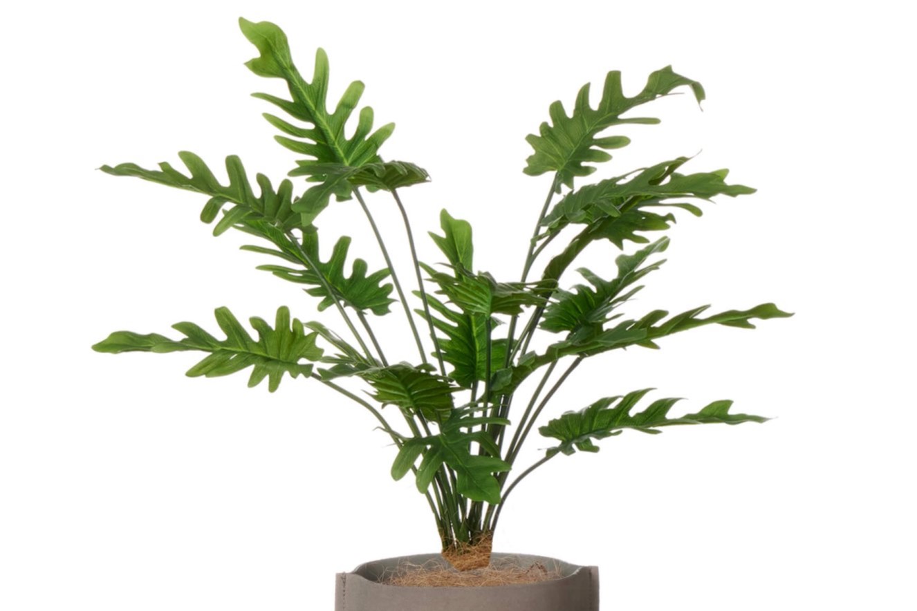 そんなクッカバラをユニークな形がぱっと目を引く、レザーを使用したインテリア性の高いグレーの鉢カバーにセット。
