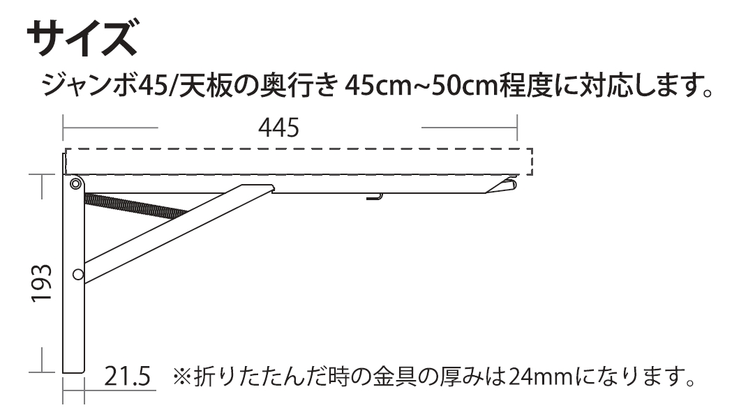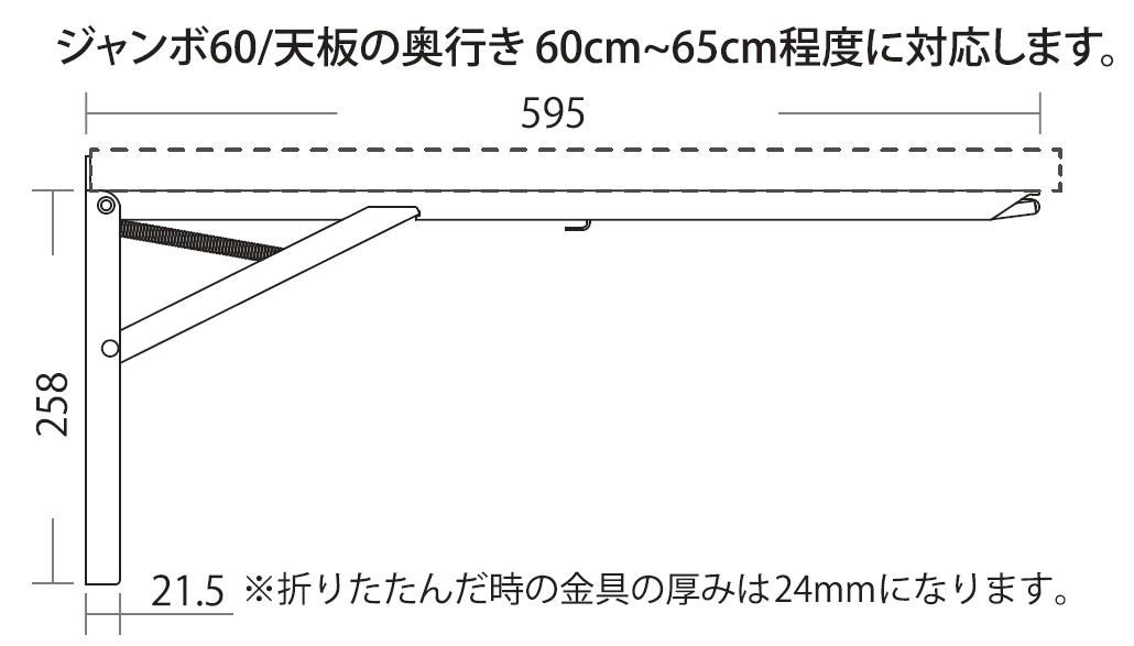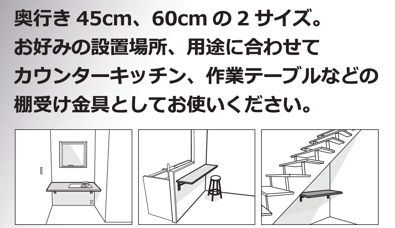 耐荷重100kgの折りたたみ式棚受け金具。ワンタッチで折りたためて抜群の耐荷重。カウンターキッチン、アイロン台、作業テーブルなどの棚受け金具としてお使いください。