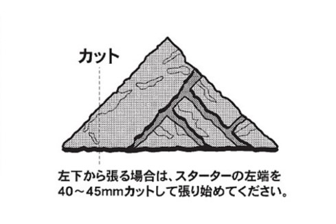 左下からの場合はスターターの左端を40〜45mm程度カットし、寸法調整後、端部(左)を使用して張り始めてください。