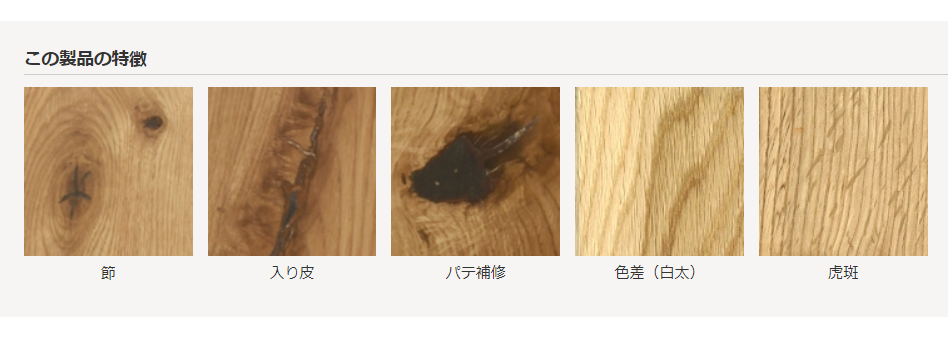 節があります。節とは、木の枝が幹に巻き込まれたものです。生きている枝が巻き込まれたものは“生節”、枯れた枝が巻き込まれたものは“死節”と呼ばれます。素材の特性としてある程度の色の濃淡に加え、木の中心付近の色が濃い部分(赤身)と、樹皮に近接する白っぽい部分(白太)が混ざるので、色差があります。さらに、入り皮(樹皮が木の内部に残ったもの)や、髄心(年輪の中心部で、細くもろい部分)、パテ補修があります。
