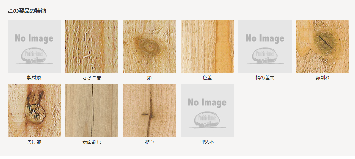 ※製材痕・ざらつき・節・色差、若干の幅の差異・節割れ・欠け節・表面割れ・髄心・埋め木補修があります。